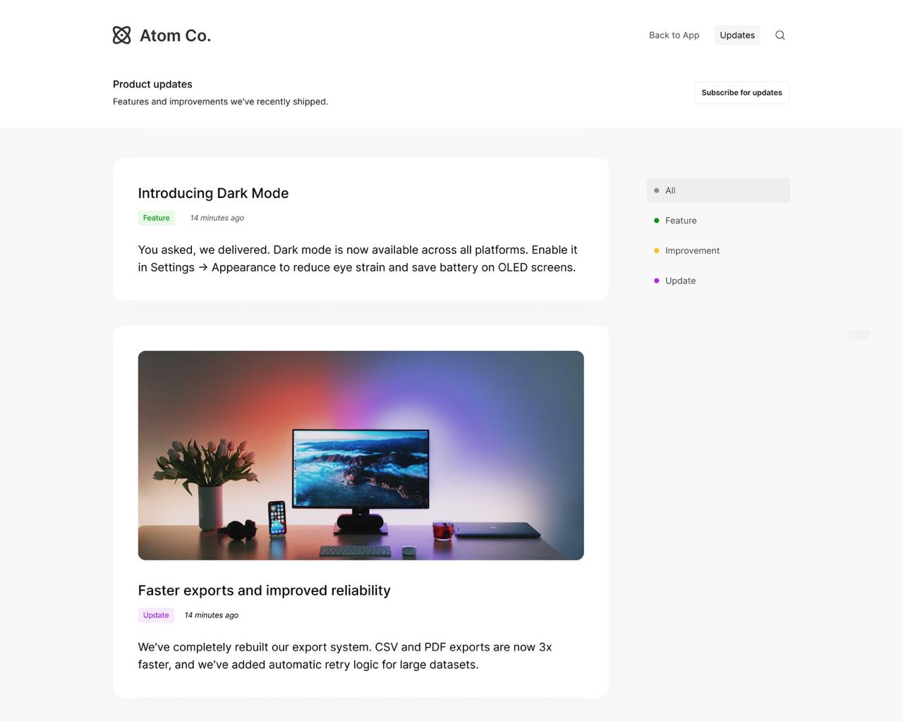 Organize updates as New, Improved, Fixed, or custom tags.